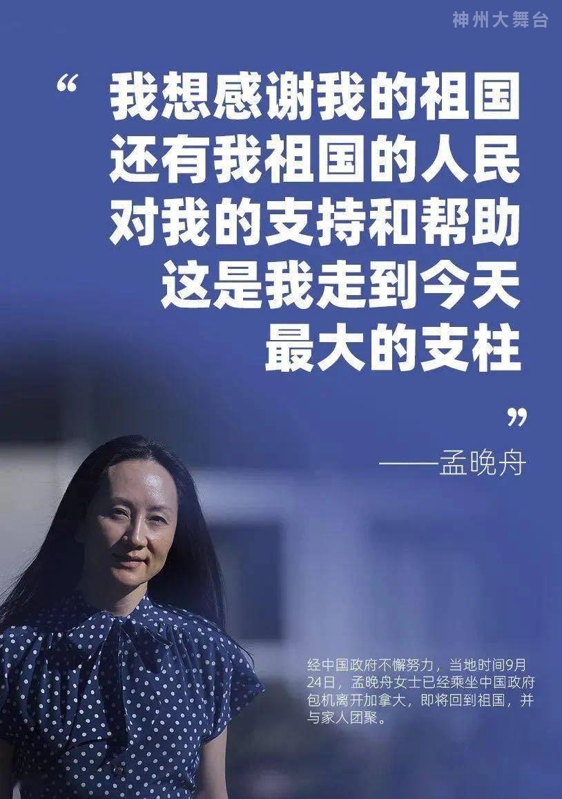 孟晚舟女士获释的消息瞬间传遍了世界的每一个角落!中国人的神经也在瞬间被点燃!这不单单是 国人对于一位同胞被恶意扣押后艰难回归的必然反应,更多的是像看到自己的姐妹被无罪释放后由衷的激动和感动,激动的是我们的亲人终于回来了!感动的是我们背后的祖国是真真正正的强大了起来,而且和自己的人民一道,紧握正义之剑,无惧强权霸权,一路追随守护,终于以胜利结束了这场外国势力丑恶的政治操弄,粉碎了它们对中国科技极尽打压的卑鄙图谋